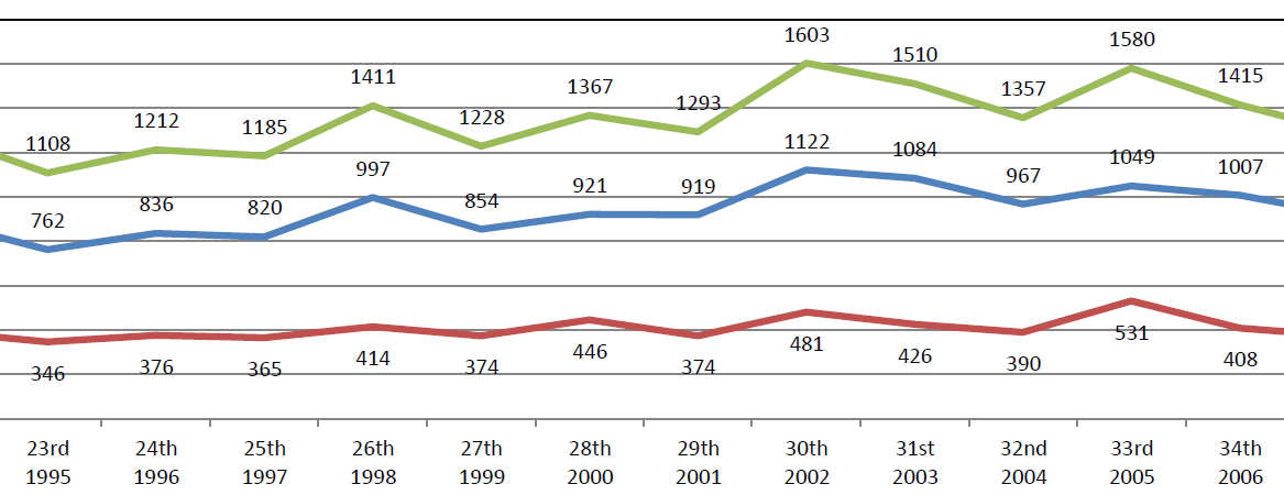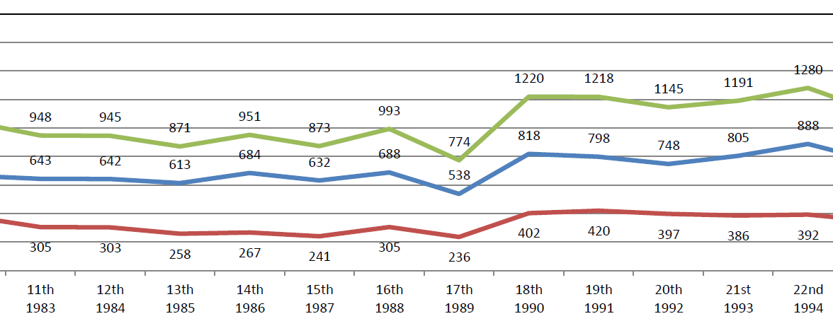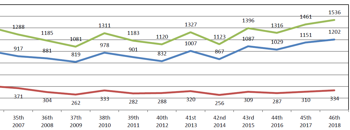 This report provides data tables showing the numbers of Teaching Elder (TE) and Ruling Elder (RE) commissioners enrolled at the 46 General Assemblies (GA) of the Presbyterian Church in America (PCA). The data presented show the steady enrollment growth of TE commissioners with participation each year almost always higher than the prior year. The total TE enrollment in 2018 was 1202 — the highest enrollment number ever. Conversely, the data also show a trend of decreasing participation levels of RE commissioners since their peak of 531 commissioners in 2002.