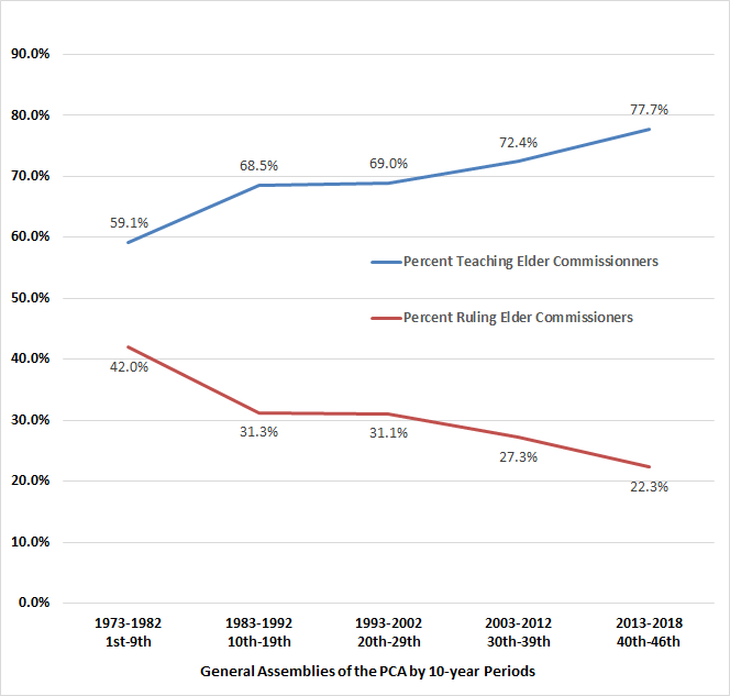 Table 4: Percent of Teaching and Ruling Elder Commissioners Enrolled at PCA General Assemblies in 10-year Periods — 1973 through 2018.